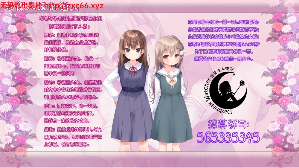 守夜人汉化组第五作《缘染此叶,化作恋红》的翻译部分已竣工,现再招一次校对,望感兴趣的同学加招募群测试,群号污溜污伞伞污伞丝污。
