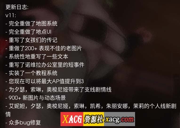 现在是时候放慢脚步,重新调整整个故事了。在这次更新中,我们没有推进任何女孩的主要故事情节;它们仍然停留在v10中停止的地方。然而,我们在女孩们现有的故事中插入了许多新场景,以充实角色,使事情不那么突然。